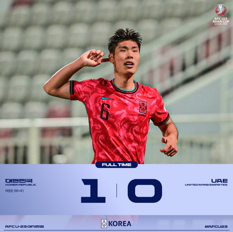1차전 4월 17일 0시30분 UAE 경기는 후반 추가 시간 극적인 이영준 선수의 헤딩골로 1:0으로 승리를 따냈습니다.